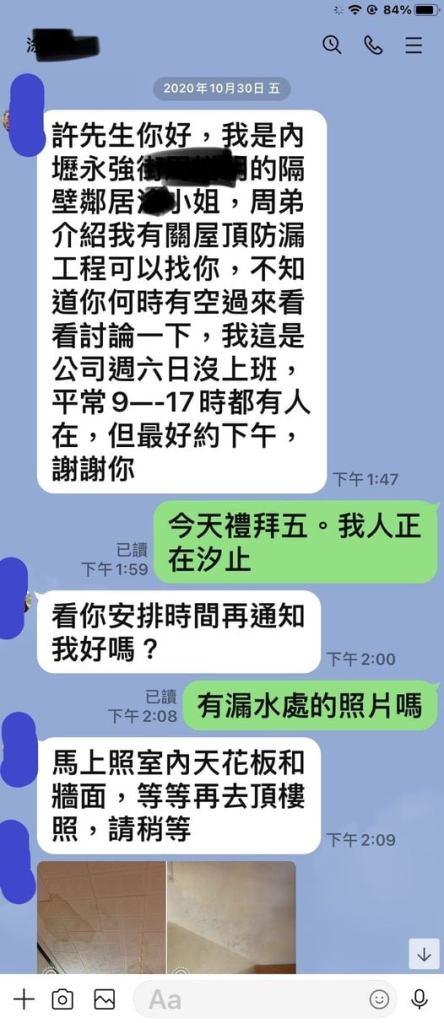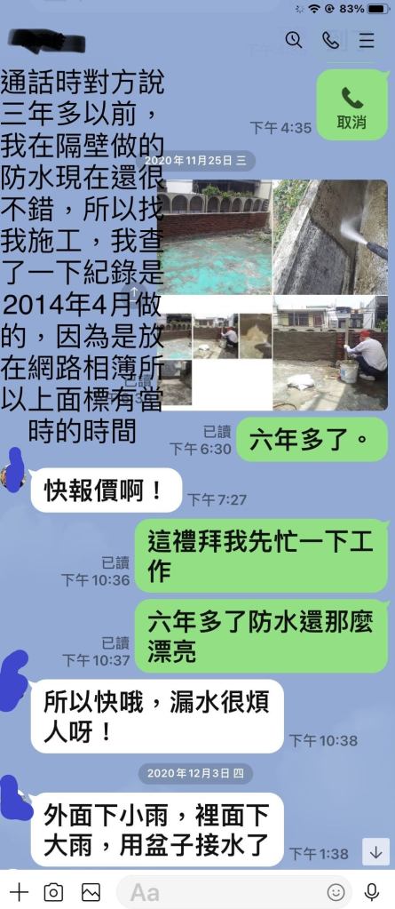 業主問了隔壁鄰居,我們大約在7年前,所做的屋頂防水,現狀有無漏水,經告知完工後至今,都沒有出現漏水現象,就詢問電話,找我們過去施工,