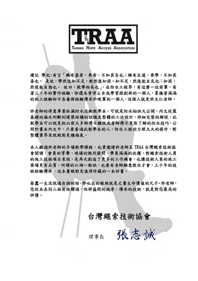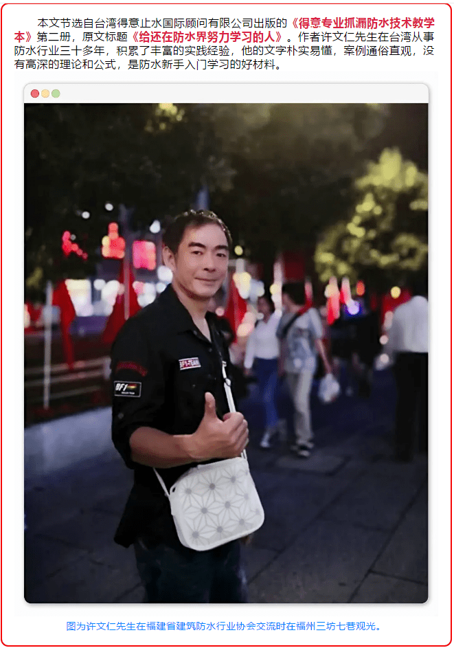這本書獲得了兩岸三地許多防水同業的肯定與推薦,這充分顯示了我們在防水領域的專業地位和影響力。這樣的成就讓我們感到自豪,也激勵我們持續推動防水技術的發展與普及。