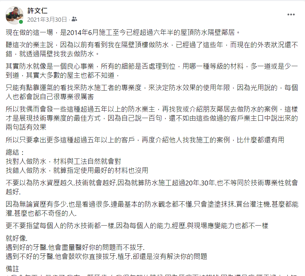 我們依舊還是一間人數不多的小公司,防水施工的工作,還是一樣由我帶著師傅在現場一起施工,雖然我有時不會整天都在施工現場,但至少每天都會注意著每一個小細節,是否有做到位,因為真正的專業,其實都表現在小細節上面,因此每天依舊也只能做一場