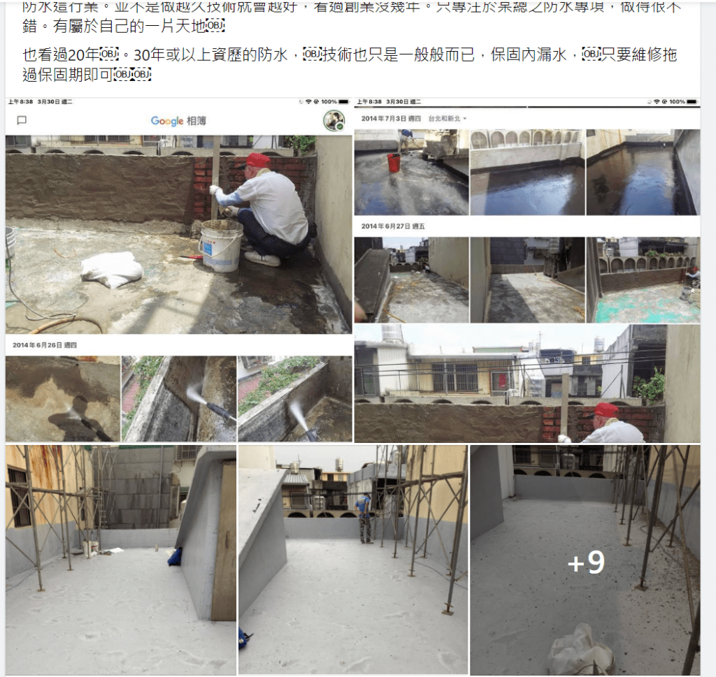 3.我們的各種止漏防水施工照片,裡面都有我的身影,可以包含地下室噴水,電梯機坑、浴室、外牆、屋頂…各種抓漏防水施工照片,很多人都可以說出一口好防水,但拿不出這麼多種親自施工的照片。