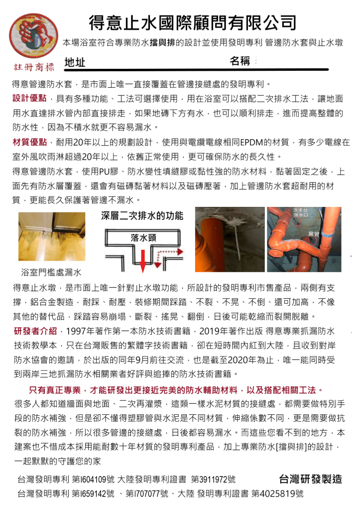 11.有確實完全按照上面的做法施工,可以在浴室防水施工現場貼上,本浴室防水符合專業防水擋與排的設計,並請貼上管邊防水套的使用說明,讓後續工班知道怎麼開孔。