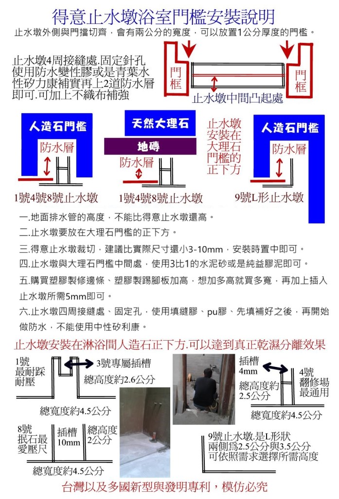 也可以想像一下,如果現在浴室地面開始放水,水會不會毫無阻力,就可以流出浴室範圍外面,如果水可以流出浴室範圍外,那麼請注意一下,水從甚麼地方流出去,如果是縫隙,就要填縫,如果是平地,就需要安裝止水墩