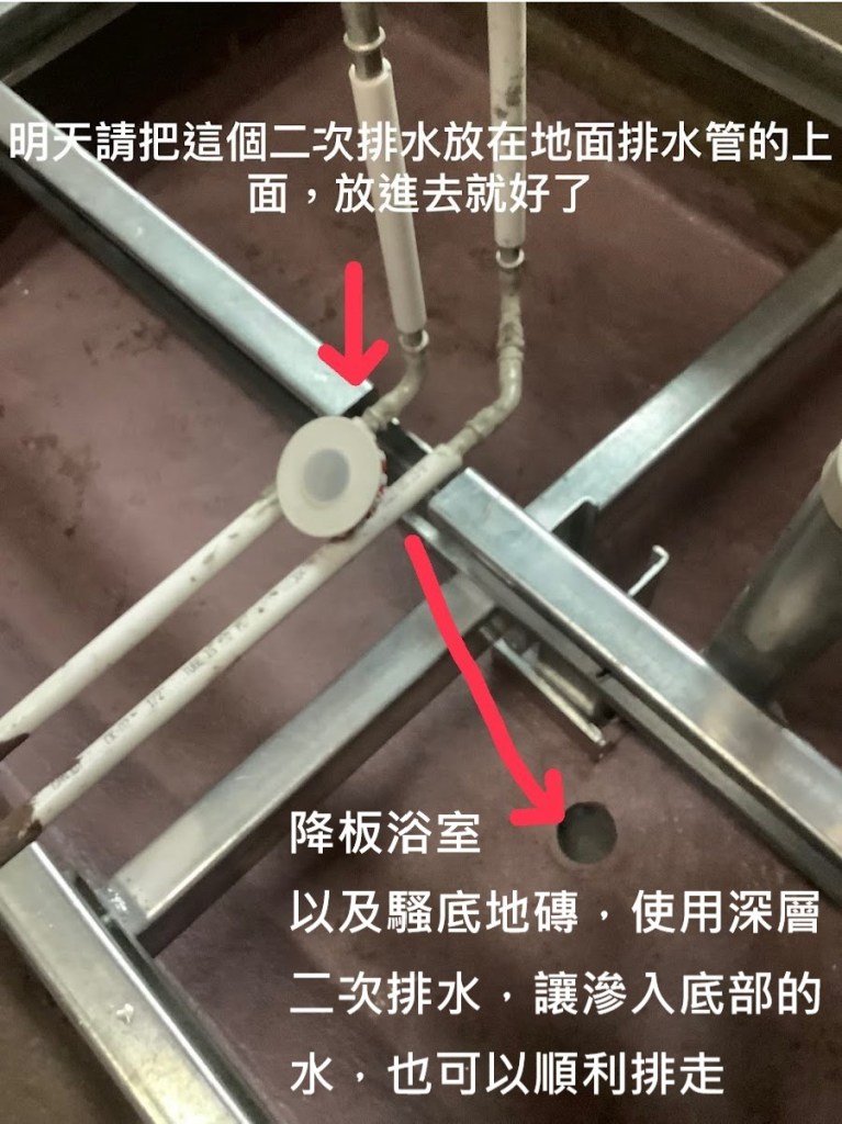 10.降版的浴室請加裝[短款的二次深層排水小物件[有封蓋]],讓滲入地磚下方的水,也可以順利排走。